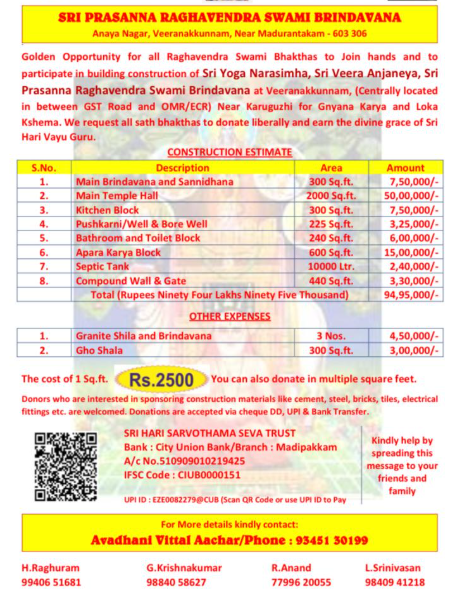 ஸ்ரீ ராகவேந்திர தீர்த்த குரு அந்தர்கத பகவத் சுவாமியின் பிரிய அர்ப்பணத்திற்காக உருவாக்க எங்களுக்கு உதவும் வகையில் தாராளமான நன்கொடைகள் மூலம் உங்கள் விரிவான ஆதரவை நாங்கள் கேட்டுக்கொள்கிறோம். தயவுசெய்து இந்த தகவலை உங்கள் உறவினர்கள் மற்றும் நண்பர்களுக்கு அனுப்புமாறு கேட்டுக்கொள்கிறோம்.